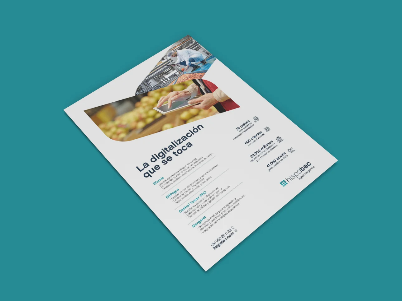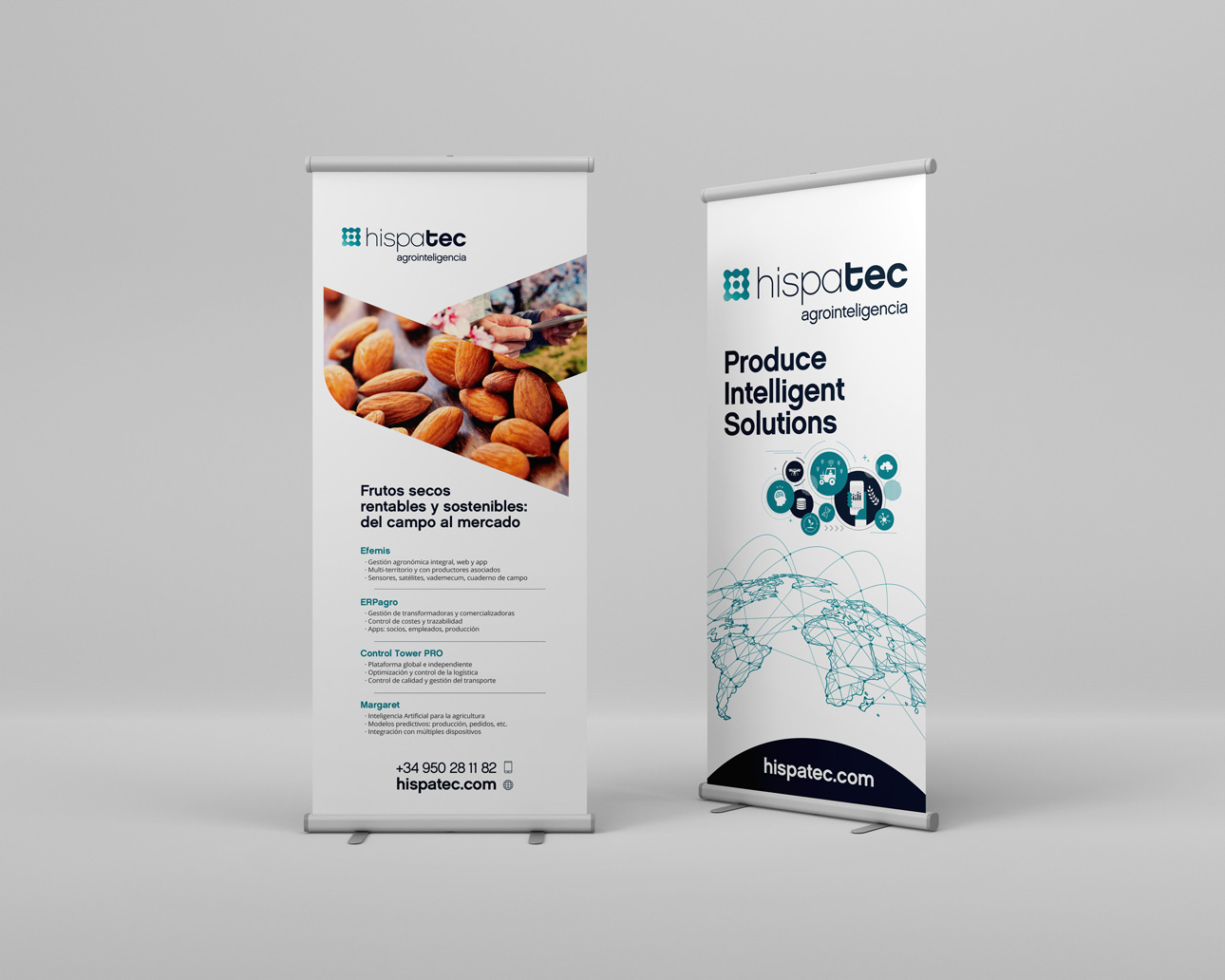 En colaboración con el departamento de marketing de Hispatec, empresa líder en tecnología agrícola, llevamos a cabo un restyling integral de su identidad visual. Este proyecto incluyó la actualización del logotipo y su aplicación en diversas piezas promocionales, como anuncios publicitarios, banners y roll-ups, asegurando una imagen coherente en todos los soportes.